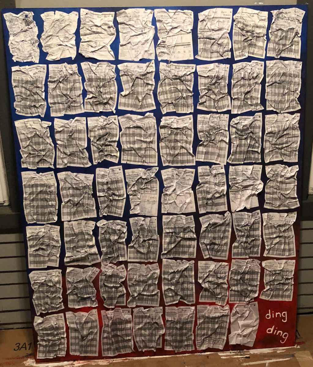 My Electronic Leash is a 4’ x 5’ painted canvas with 55 pages of a phone bill mounted to its surface showing the incessant texts and calls Rondinone’s abuser would make to keep tabs on her and increase his grip of control.