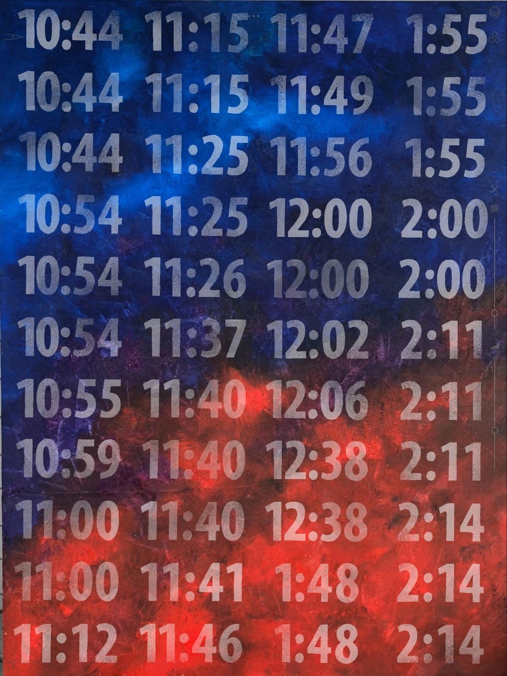 Another canvas, which is a companion piece to Rondinone’s My Electronic Leash is an unnamed red and blue piece with a series of time stamps on it.